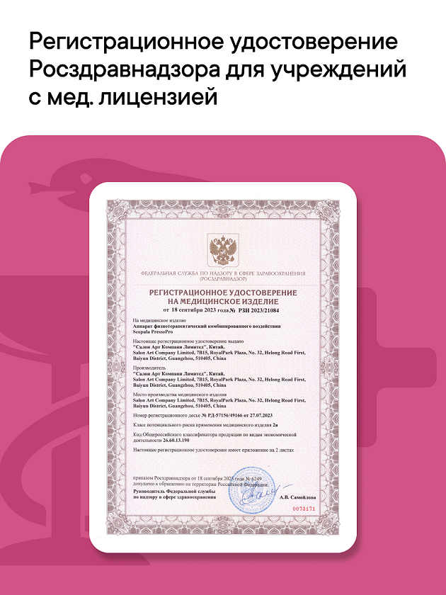 Имеет Регистрационное удостоверение Росздравнадзора №РЗН 2023/21084 от 18.09.2023